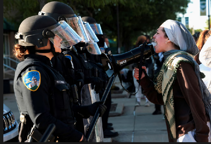 La policía universitaria, local y estatal invadió a los manifestantes, y un video mostró a los agentes diciéndoles a la gente que se fuera y luego quitando carteles y parte de una barricada, informaron las estaciones de noticias locales. Parecía haber algunos empujones entre la policía y los manifestantes. Los agentes llevaban bridas y parecieron detener a algunas personas.