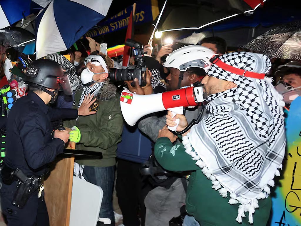El periódico de UCLA, Daily Bruin, compartió imágenes de un enfrentamiento anoche sobre las 23:00 horas entre elementos de la policía del campus y de la ciudad, así como de agentes de la Patrulla de Caminos de California con manifestantes.