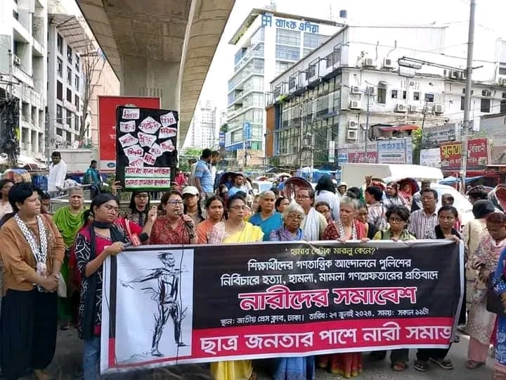 En estas circunstancias, un grupo de mujeres se reunieron hoy en Old Paltan Mor, Dhaka, para manifestarse en contra de los incidentes violentos registrados desde hace una semana en la nación surasiática.