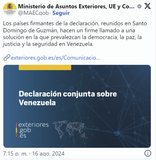 El manifiesto fue suscrito por Argentina, Canadá, Chile, República Checa, Costa Rica, Ecuador, España, Estados Unidos de América, Guatemala, Guyana, Italia, Marruecos, Países Bajos, Reino Unido, Panamá, Paraguay, Perú, Portugal, República Dominicana, Surinam, Uruguay y la Unión Europea, hace un firme llamado a la sensatez y la cordura en Venezuela.