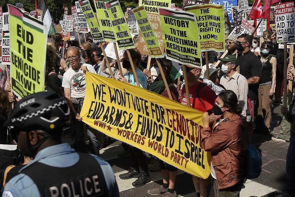 El parque donde se realizó la mayoría de los arrestos, ubicado a una calle del centro de convenciones donde se realiza el evento, sirvió como punto de destino para una marcha de miles de personas que hicieron un llamado a un cese al fuego en la guerra entre Israel y Hamás. Varias docenas de activistas se apartaron del grupo principal, atravesaron las vallas y fueron repelidos por la policía.