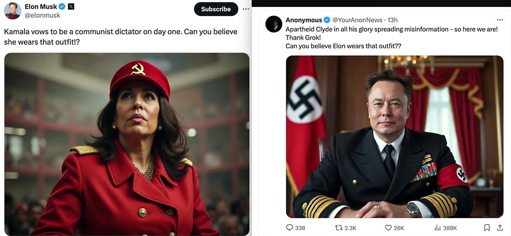 Elon Musk enfrenta criticas al publicar imagen generada de Kamala Harris vestida como dictadora comunista