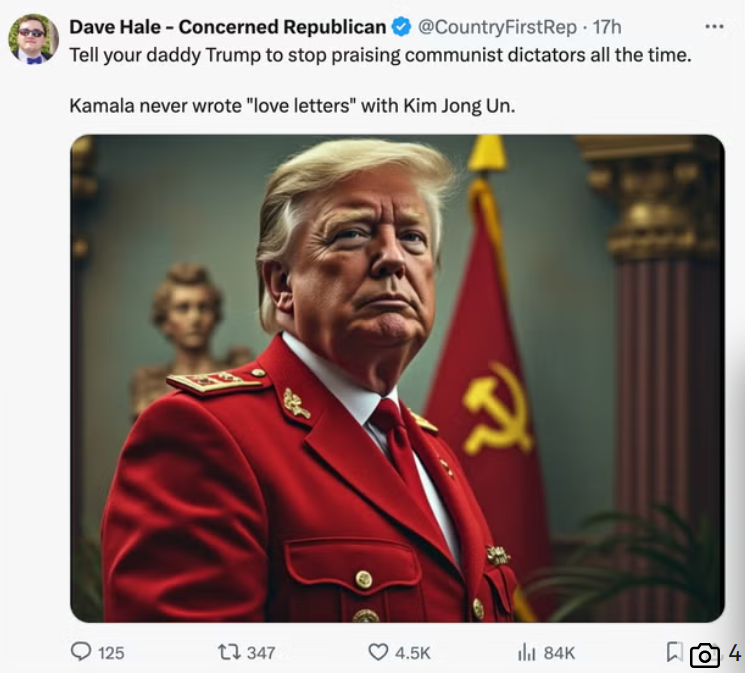 Luego, más tarde, compartió una imagen generada por IA de Harris con un uniforme comunista rojo y escribió sarcásticamente: “Kamala promete ser una dictadora comunista desde el primer día. ¿¡Puedes creer que ella usa ese atuendo!?