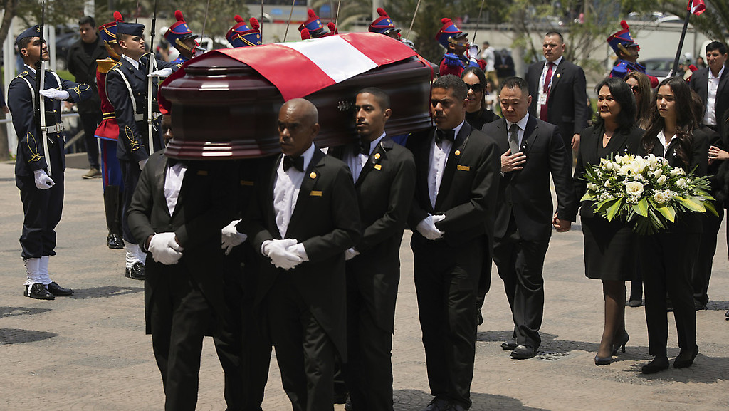 En la imagen, que quedó captada también por medios internacionales, se observa a los hombres con esmóquines negros y guantes blancos llevando el ataúd en los hombros y, más atrás dos de los cuatro hijos del exmandatario, Keiko y Kenji Fujimori Higuchi.
