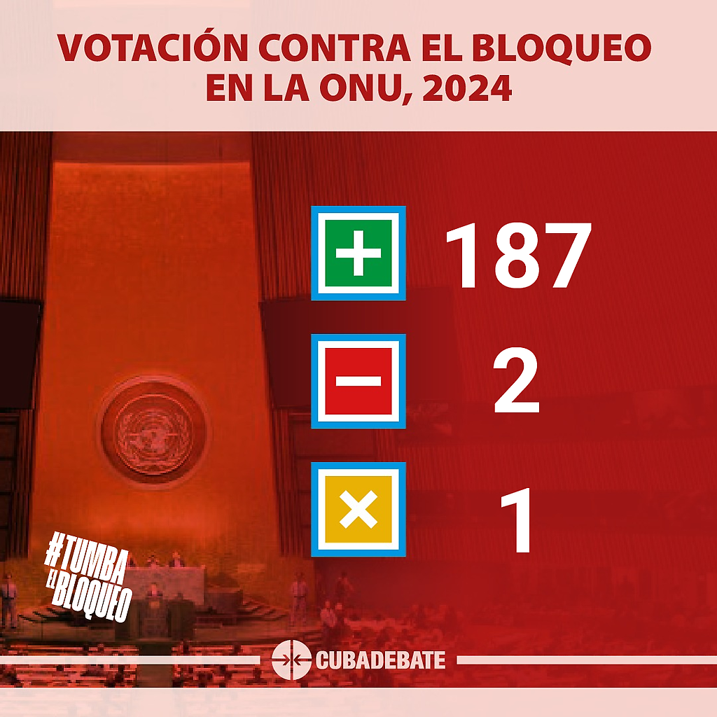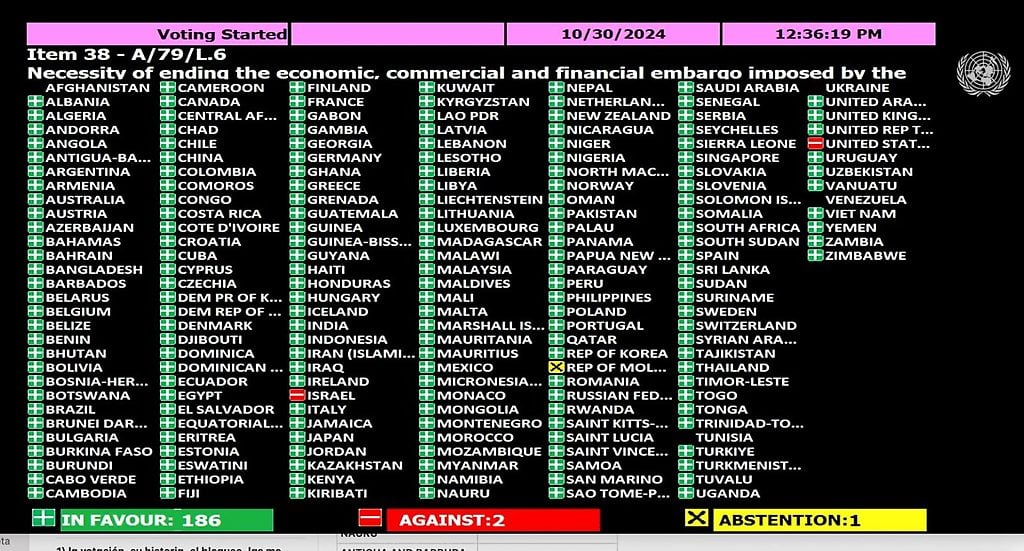 30 de octubre de 2024.- La resolución presentada por Cuba en esta jornada para pedir el fin del bloqueo económico, comercial y financiero impuesto por Estados Unidos fue aprobada de manera contundente por la Asamblea General con 187 votos a favor.