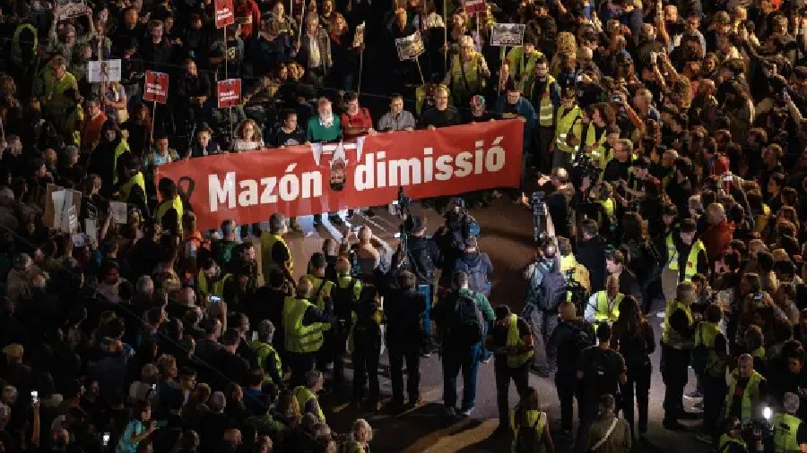 Entre cientos de pancartas y objetos depositados por los asistentes en el Ayuntamiento en recuerdo de las más de 200 víctimas, la protesta ha arrancado minutos después de las 18.00 horas (locales). Al frente, había personas directamente afectadas por la riada del pasado día 29 que avanzaban con una pancarta con el lema de la manifestación (Mazón dimisión) y la imagen del presidente cabeza abajo y ataviado con el chaleco de emergencias.