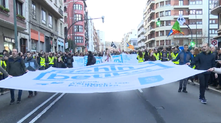 También han desfilado con los manifestantes representantes sindicales vascos, como el secretario general de ELA, Mitxel Lakuntza, y el coordinador general de LAB Igor Arroyo, además de integrantes de ESK, Steilas, Hiru, EHNE, CGT, CNT y Etxalde, y de colectivos como Bakebidean, Gure Esku Dago, Egiari Zor, Paz con Dignidad, Harrera, Etxerat o Ernai.