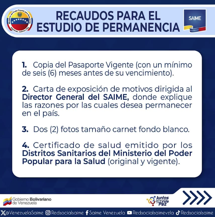 Entre los recaudos se encuentran: copia del pasaporte vigente (con un mínimo de seis (6) meses antes de su vencimiento), una carta de exposición de motivos dirigida al Director General del Saime, en la que se expliquen las razones por las cuales se desea permanecer en el país, así como también dos (2) fotos tamaño carnet con fondo blanco, y un certificado de salud emitido por los Distritos Sanitarios del Ministerio del Poder Popular para la Salud (original y vigente).