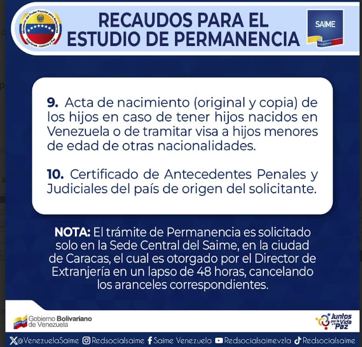 Cabe resaltar que esta solicitud se realizará solo en la Sede Central del Saime, ubicada en la avenida Baralt de Caracas, emitido por autoridades en materia de extranjería, el cual tiene un lapso de 48 horas, cumpliendo con todos los procesos que amerita el procedimiento.