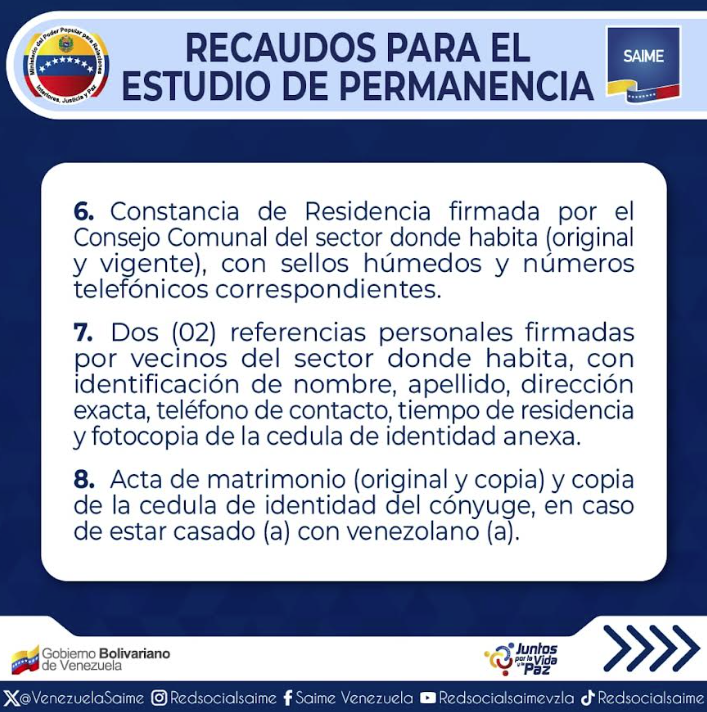 También se debe presentar una constancia de residencia firmada por el Consejo Comunal del sector donde se habita (original y vigente), con sellos húmedos y números telefónicos correspondientes; dos (2) referencias personales firmadas por vecinos del sector donde se reside, con identificación de nombre, apellido, dirección exacta, teléfono de contacto, tiempo de residencia y fotocopia de la cédula de identidad anexa; acta de matrimonio (original y copia) y copia de la cédula de identidad del cónyuge, en caso de estar casado(a) con un venezolano(a).