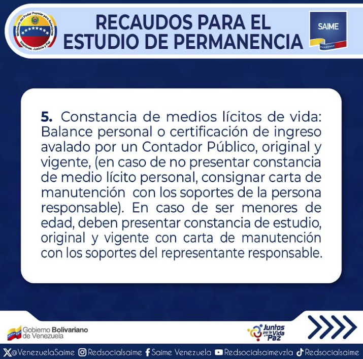 15 de enero de 2025.'El Servicio Administrativo de Identificación, Migración y Extranjería (Saime) informa a través de sus cuentas oficiales en redes sociales a los ciudadanos extranjeros cuáles son los documentos necesarios para la solicitud de un Estudio de Permanencia al gestionar el respectivo trámite en todo el territorio nacional, informó Prensa SAIME.