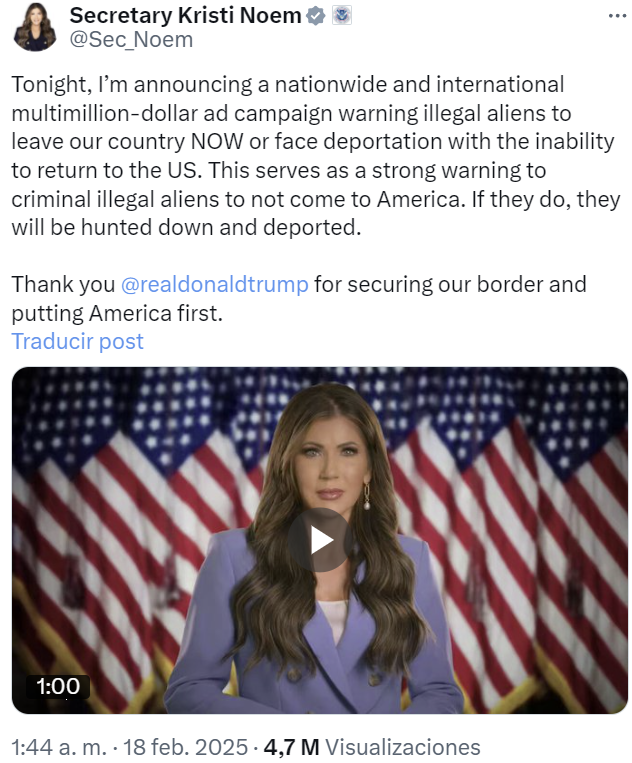 Kristi Noem, secretaria de Seguridad Interna, anunció la iniciativa que se difunde a través de televisión, radio y plataformas digitales en varios idiomas. En el mensaje oficial, Noem afirmó que quienes permanezcan ilegalmente en el país serán perseguidos y expulsados.