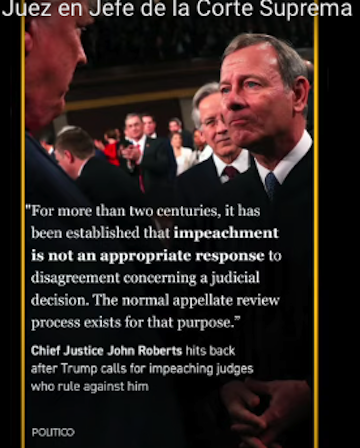 Viernes, 21 de marzo de 2025.- Nadie está por encima de la ley dejó muy en claro el presidente del Tribunal Supremo de EEUU, John Roberts, ante la reacción del presidente Trump en contra del juez Boasberg, quien intento detener la expulsión masiva de un grupo de venezolanos hacia El Salvador, acusados de pertenecer a la organización delictiva El Tren de Aragua.