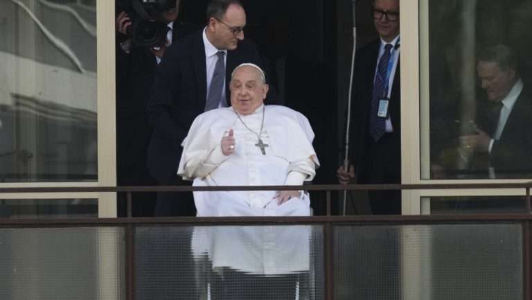 El papa salió en silla de ruedas al balcón del hospital, donde saludó a la multitud y bendijo a todos los presentes que esperaban su aparición.