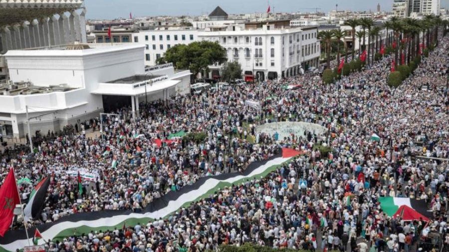 Bajo un océano de banderas iraníes y palestinas, los participantes levantan carteles que condenan la ocupación de Israel y la infracción a la santidad de la Mezquita Al-Aqsa, al tiempo que declaran el "inevitable derrumbe" del régimen de Tel Aviv.