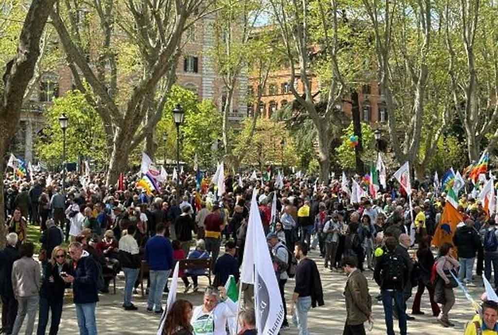 5 de abril de 2025.- Una multitudinaria manifestación, convocada por el izquierdista Movimiento Cinco Estrellas (M5S), recorrió hoy las calles de Roma para pronunciarse contra los planes armamentistas de Europa.