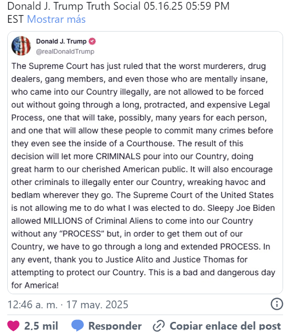 17-05-25.-El presidente de Estados Unidos, Donald Trump, acusó este viernes a la Corte Suprema de bloquear sus promesas de campaña después de que le impidiera reanudar la expulsión de migrantes venezolanos usando una ley del siglo XVIII.