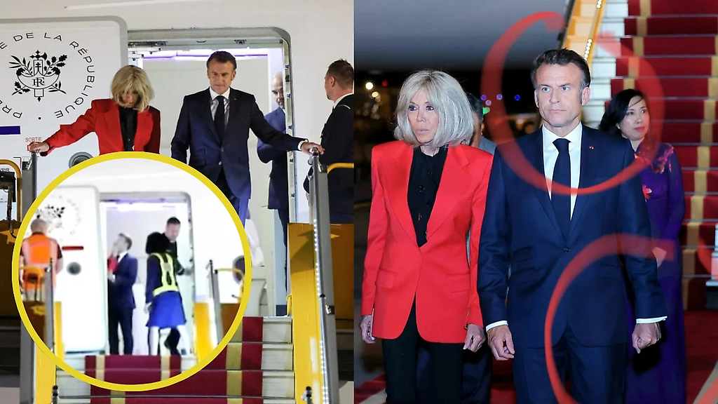 Antes de salir del avión presidencial en Hanói, imágenes captadas por la agencia de noticias Associated Press muestran a Macron hablando con su esposa Brigitte -de la que solo se ven los brazos, cuando de repente esta le empuja violentamente el rostro con ambas manos.
