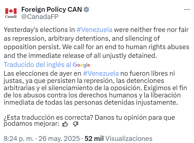 Por medio de un post en X, la Cancillería canadiense denunció: «Las elecciones de ayer en Venezuela no fueron libres ni justas, ya que persisten la represión, las detenciones arbitrarias y el silenciamiento de la oposición. Exigimos el fin de los abusos contra los derechos humanos y la liberación inmediata de todas las personas detenidas injustamente».