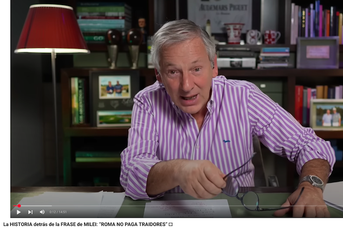 Comenta la historia donde dos traidores asesinan a un general romano y como son rechazados cuando van cobrar lo que consideraban su recompensa y añade que esta historia no tiene ninguna coincidencia con el uso que intentó hacer el presidente argentino, Milei, de ella.