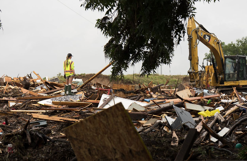 Trabajadores operan maquinaria pesada para limpiar escombros el domingo en Hunt, Texas.