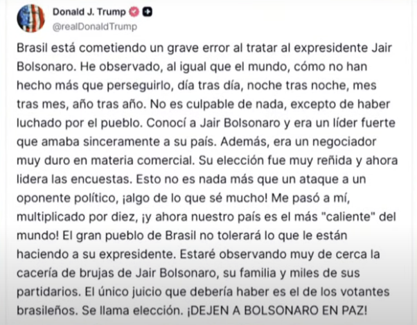 «Brasil está tratando de forma terrible al expresidente Jair Bolsonaro. He observado, al igual que el mundo, cómo no han hecho otra cosa que perseguirlo, día tras día, noche tras noche, mes tras mes, año tras año. ¡Él no es culpable de nada, salvo de haber luchado por EL PUEBLO!», escribió en su red Truth Social.