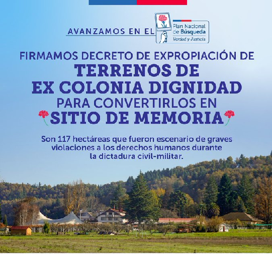 El Gobierno de Chile informó de manera oficial la expropiación de 117 hectáreas de la antigua Colonia Dignidad, un área fundada por los nazis y que funcionó como centro de tortura y represión durante la dictadura de Augusto Pinochet (1973-1990), a fin de convertirlo en un espacio para recordar a las víctimas.