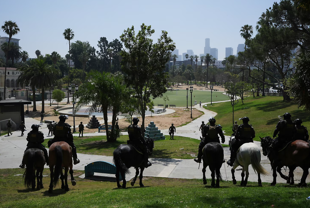 Agentes federales cabalgan en el Parque MacArthur, Los Ángeles, 7 de julio de 2025.