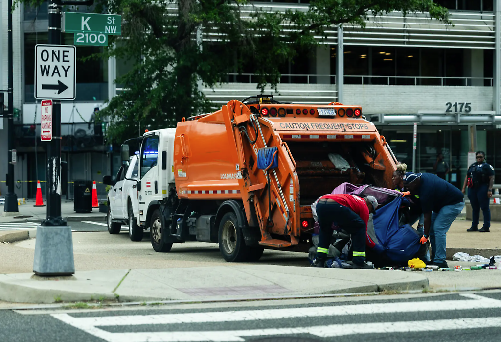 Trabajadores del Departamento de Obras Públicas de Washington cargaron una tienda de campaña en un camión de basura después de que la Policía Metropolitana desalojó un campamento de personas sin hogar en Washington Circle. Crédito...