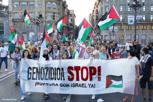 6 de septiembre de 2025.- La ciudad de Bilbao (País Vasco, España) vibró con el repique de cacerolas en una cacerolada multitudinaria convocada por Gernika-Palestina, que recorrió la ciudad desde la Plaza Circular hasta la emblemática Plaza Miguel de Unamuno en el Casco Viejo. Más de mil personas respondieron al pulso solidario, en una movilización que se replicó en 109 municipios de Euskal Herria.