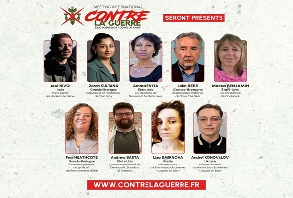 «El domingo 5 de octubre, en París, tendrá lugar un acontecimiento internacionalista de enorme importancia. Una cita de todos los anti-guerra, de todos los militantes contra la guerra, contra el genocidio en Palestina, contra las invasiones imperialistas en todo el mundo. Os invito a participar porque será un momento sumamente inspirador, con la participación de militantes del mundo entero para intercambiar sus experiencias y, sobre todo, coordinarse para librar juntos las batallas necesarias contra la guerra y el imperialismo».