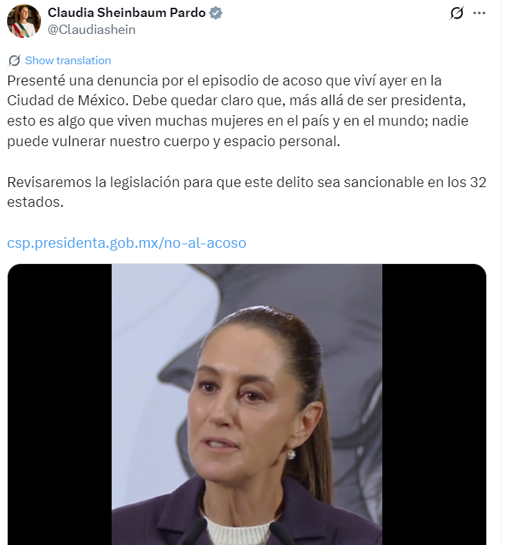 “Debe quedar claro que, más allá de ser presidenta, esto es algo que muchas mujeres experimentan en el país y en el mundo; nadie puede violar nuestro cuerpo ni nuestro espacio personal”, escribió Sheinbaum en español en X.