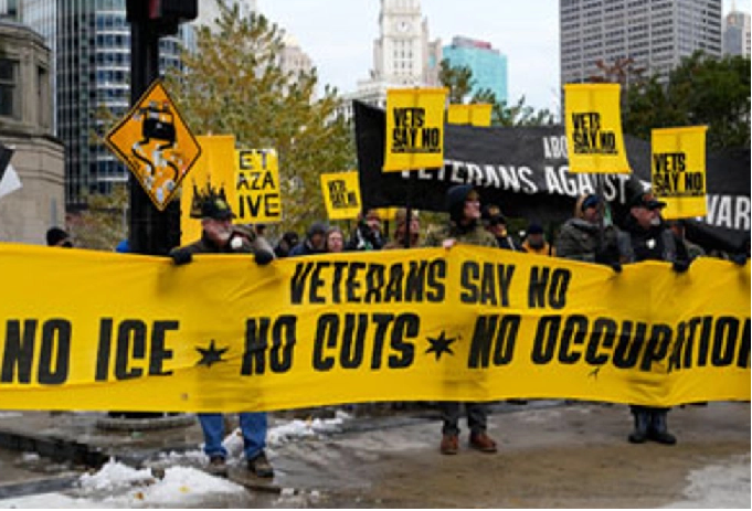Otro veterano de los Marines narró a los 200 participantes en la protesta que “son las mismas fuerzas que ocuparon a Irak y Afganistán las que ahora ocupan ciudades estadounidenses… En este día de veteranos yo no me pongo de pie con la bandera nacional, yo me pongo de pie con el pueblo”.