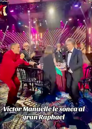 Miércoles, 19 de noviembre de 2025.- En una ocasión de gala, Victor Manuel le soneó al gran Raphael de España y este no aguantó y se puso a bailar, genio y figura y un gran ejemplo para todos.