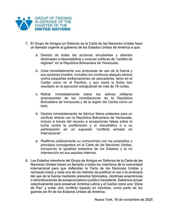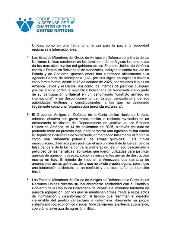 El Grupo de Amigos en Defensa de la Carta de las Naciones Unidas expresó su más firme rechazo a la reciente escalada militar de los Estados Unidos (EE. UU.) en el mar Caribe, motivada por la llegada del portaaviones USS Gerald Ford y la ejecución de la denominada «Operación Lanza del Sur».