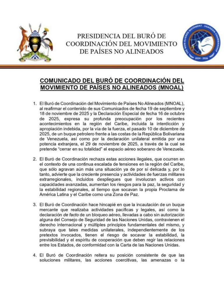 Según el documento, el MNOAL rechaza enfáticamente la "interdicción y apropiación indebida, por la vía de la fuerza" de un buque petrolero el pasado 10 de diciembre de 2025. Asimismo, el grupo condenó la declaración emitida por Estados Unidos (EEUU) sobre el intento de "cerrar en su totalidad el espacio aéreo soberano de Venezuela".