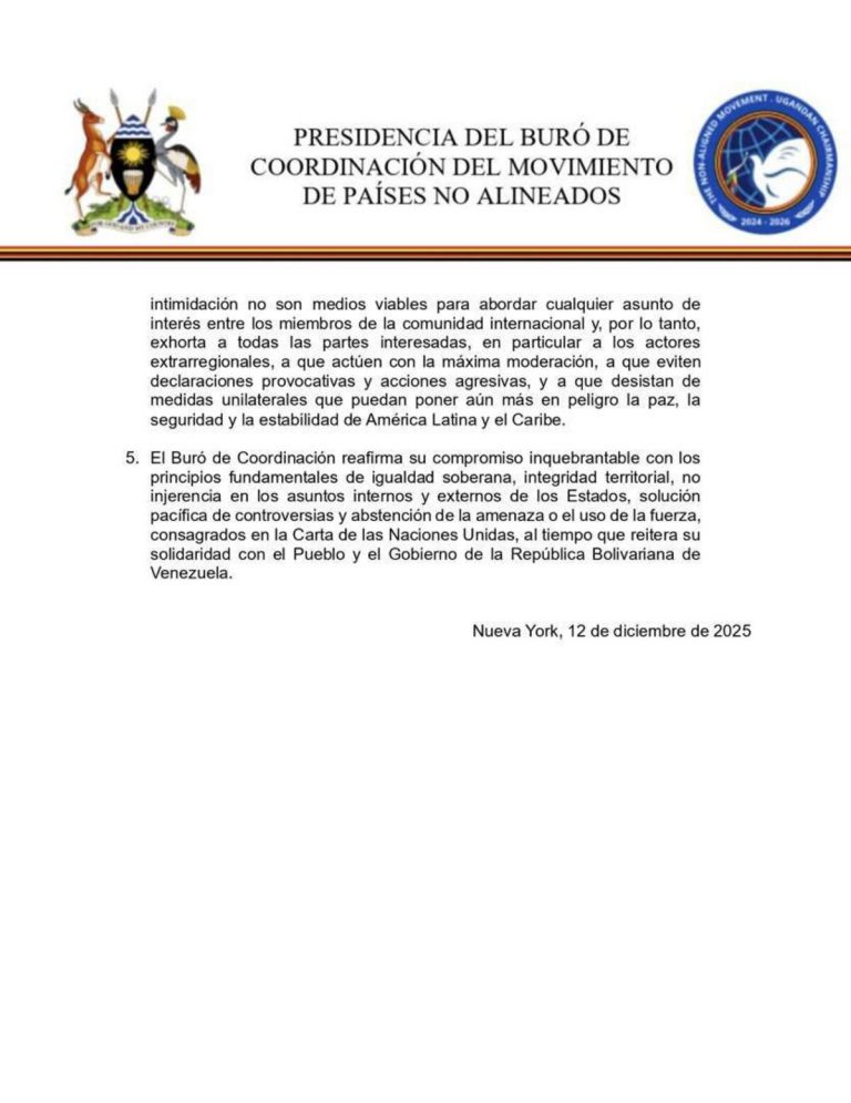 El Movimiento de Países No Alineados reiteró su solidaridad con el Pueblo y el Gobierno de Venezuela. El organismo reafirmó su compromiso con la «igualdad soberana, integridad territorial y no injerencia en los asuntos internos», principios consagrados en la Carta de las Naciones Unidas.