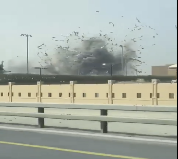 Misil balístico iraní impactando contra la sede de la 5ª Flota de la Marina de EE.UU. en la Actividad de Apoyo Naval (NSA) Baréin