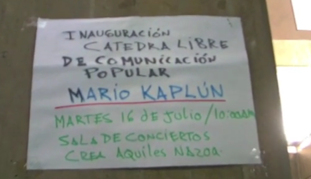 La Cátedra de Comunicación Popular Mario Kaplún fue creada, entre otros fines, para contribuir desde las experiencias formativas a: "desenmascarar los procesos ocultos de la dominación mediática a través del uso consciente de las nuevas herramientas comunicacionales, proponiendo diferentes modos de acción, abiertos a la escucha de las necesidades comunitarias, que van desde el desarrollo de un plan de acción que contempla talleres, foros, y cine foros, encuentros, desarrollo de contenidos,.. y la creación de un laboratorio de comunicación popular en tiempos de 'guerra no convencional', apuntando a una formación constante en el área de la comunicación...".