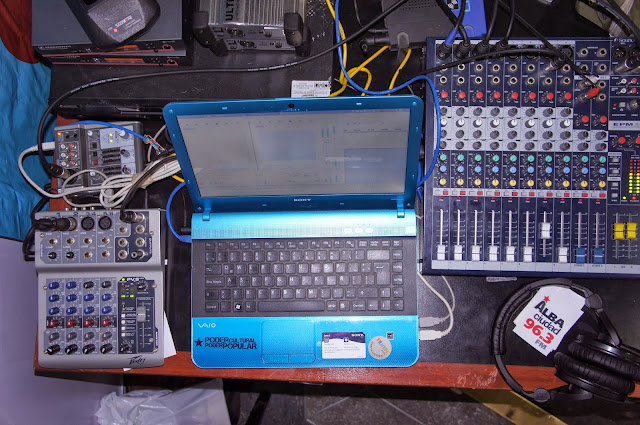 La interfaz pequeña a la izquierda es una Behringer Xenyx 302 USB, personal y mía, que me costó hace 2 años unos Bs. 800; esa la usamos como interfaz de entrada para poder transmitir usando el software libre IDJC; dicho sea de paso, el aumento de precio especulativo que ha tenido en los últimos meses me hará imposible reponerla si se daña o se pierde, pues hoy la venden a Bs. 4.500. La otra interfaz abajo a la izquierda, una Peavey PV6, tampoco es de la emisora; es prestada y la usamos como entrada del audio de los conciertos, para poder grabarlos de forma independiente. Costaba Bs. 2 mil hace dos años, pero en la actualidad la venden a Bs. 8 mil.