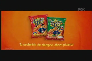 Cheese Tris, un producto de PepsiCo., tiene cuñas en varios canales de cable, de un muchacho deprimido hablando con un Cheese Tris gigante porque todos sus amigos le caen a su hermana.