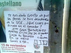 Encontramos que la gran mayoría de los estudiantes estaban dejando las bandejas en las mesas del comedor. No habían discursos, ni mayores explicaciones; las hermosas sifrinas ucevistas y sus compañeros varones simplemente dejaban las bandejas y se iban con una sonrisa pícara entre sus dientes, poniéndose los audífonos de sus iPods en las orejas mientras caminaban a clase. Sólo un papel en una de las mesas, rodeado de bandejas sucias, brindaba una explicación: