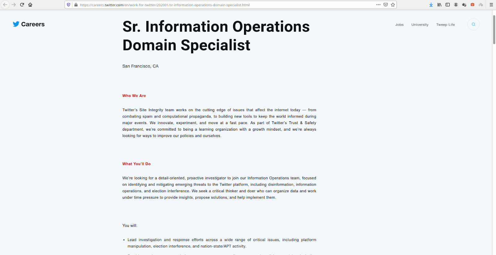 En el anuncio en su página web, explican que el aspirante deberá "identificar y mitigar amenazas contra la plataforma de Twitter, incluida la desinformación, las operaciones de información y la interferencia electoral". También señalan que deberá "liderar los esfuerzos de investigación y respuesta en una amplia gama de problemas críticos, incluida la manipulación de la plataforma, la interferencia en asuntos electorales y las amenazas persistentes avanzadas (APT), patrocinadas por naciones-estados".