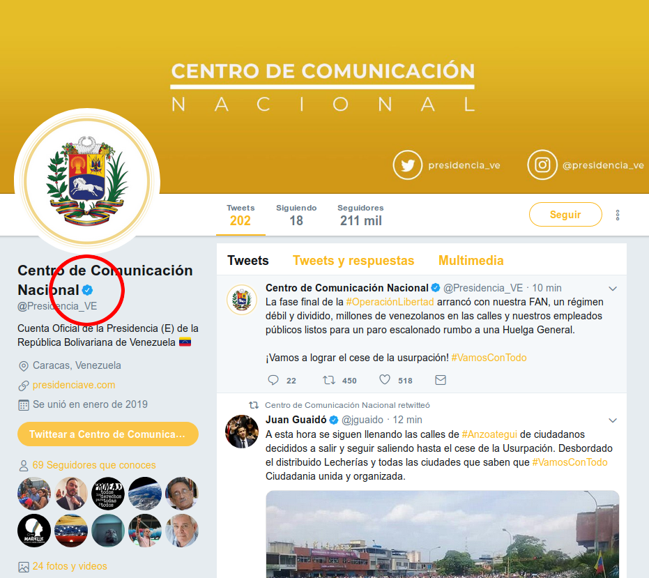 Pero a comienzos de 2019 fue creada la cuenta de la supuesta "Presidencia" de Juan Guaidó, @Presidencia_VE, que es llevada por el Centro de Comunicación Nacional, dirigido por Alberto Federico Ravell, exdirector de Globovisión y director del medio digital La Patilla. Sorprendió mucho que la cuenta, desde sus inicios, fue marcada como "Cuenta Verificada".