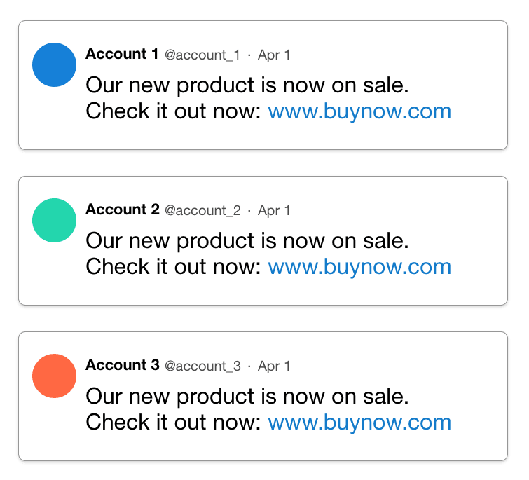 Si tienes varias cuentas distintas, en las que deseas publicar el mismo contenido, se recomienda que retuitees el contenido de una cuenta utilizando las cuentas restantes.
