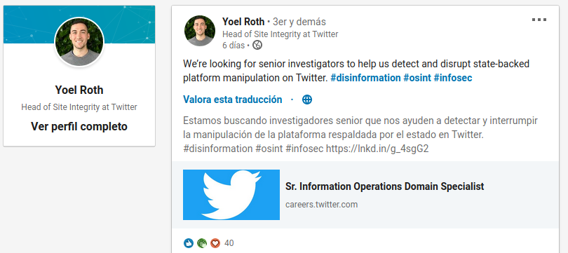 De hecho, Twitter está reforzando su equipo y está solicitando investigadores para "ayudarnos a detectar y desactivar manipulaciones a la plataforma de Twitter organizadas por un estado".