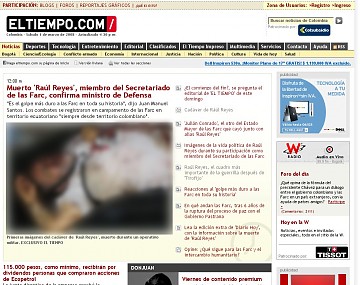 La imagen del cadáver, con el rostro ensangrentado y una franela blanca llena de sangre, con el dibujo de Manuel Marulanda, se publica en la portada del sitio web del conocido periódico colombiano sin ninguna advertencia previa, "como si fuera un trofeo", según dijo el periodista colombiano Jorge Botero en una entrevista telefónica realizada por el canal Venezolana de Televisión.