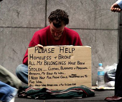 Una persona desamparada pidiendo ayuda, dinero, o comida en tiempos de crisis