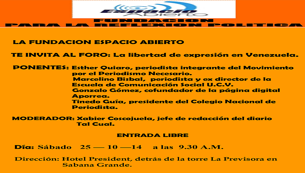 Foro sobre La Libertad de Expresión tendrá lugar este sábado 25 a las 9:30 am en el Hotel President (próximo al Metro Plaza Venezuela, detrás de La Previsora, en la zona de Sabana Grande), en la ciudad de Caracas.