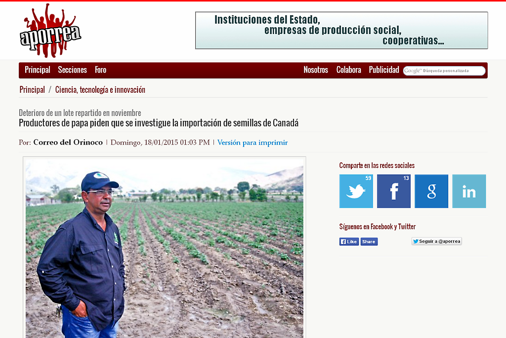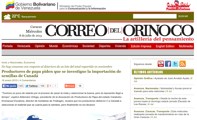 9 julio 2015 - Desde principio de este año los productores de papa venezolanos habían alertado sobre la adquisición de semillas del tubérculo en mal estado que habían sido importadas desde Canadá. según lo reseña un reportaje publicado por el estatal diario El Correo del Orinoco el 18 de enero.